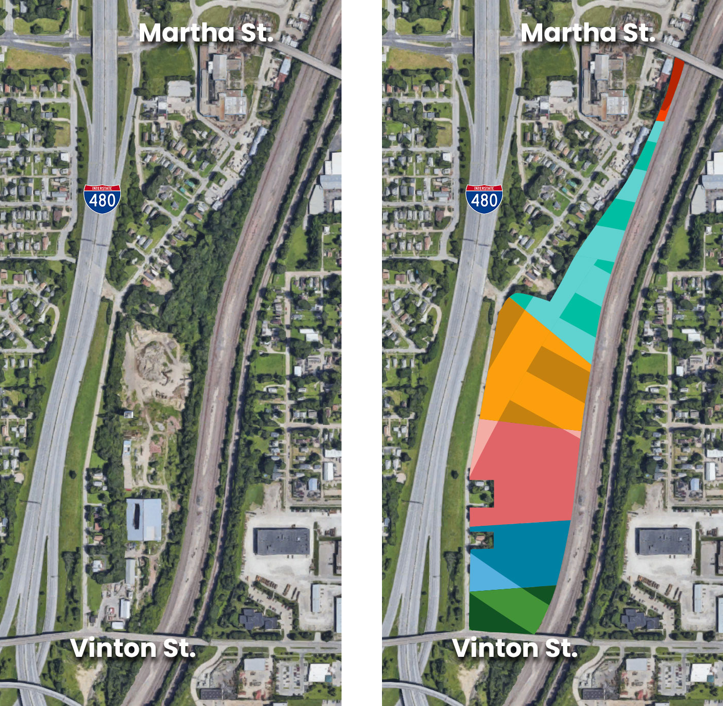 The project site spans 25 acres. The boundaries of The Intersections are Martha Street to the North, Deer Park Blvd. to the South, I-480 to the West, and the Union Pacific railroad tracks to the East.